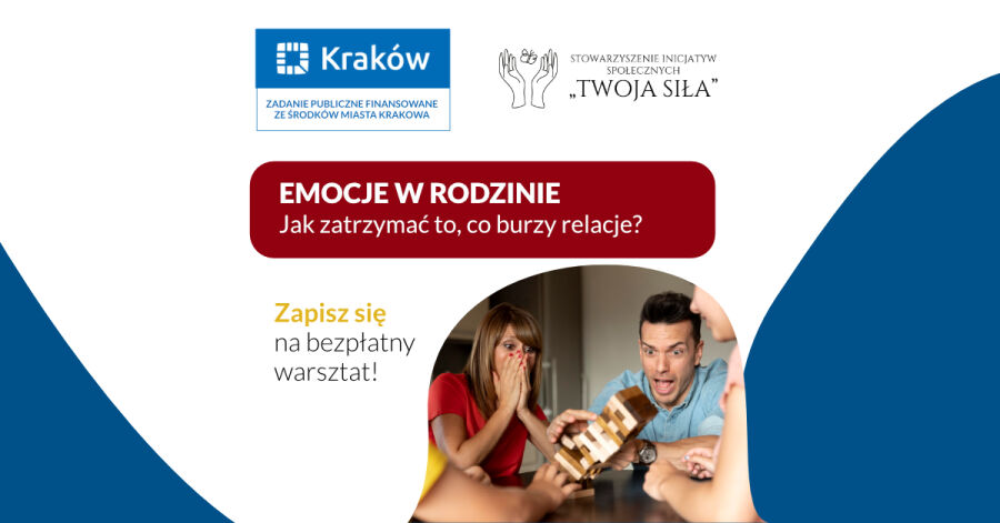 Stowarzyszenie Inicjatyw Społecznych „Twoja siła” zaprasza na warsztaty „Emocje w rodzinie. Jak zatrzymać to, co burzy relacje?”. Warsztaty przeznaczone są dla mieszkańców Gminy Miejskiej Kraków pozostających w relacjach rodzinnych: małżonkowie, partnerzy, rodzice itp. Projekt finansowany jest przez Urząd Miasta Krakowa, a zatem udział w warsztatach jest bezpłatny.