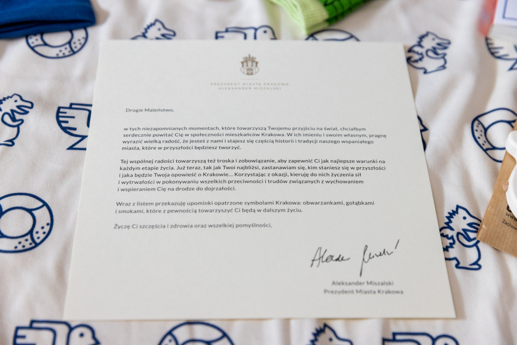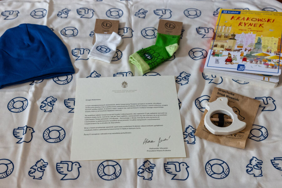 Wraz z listem powitalnym od prezydenta Krakowa maluchy otrzymują zestaw przydatnych drobiazgów, które niezmiennie wywołują uśmiech krakowskich dzieci i ich najbliższych. To specjalnie zaprojektowane, bezpieczne, ekologiczne i wyprodukowane z wysokiej jakości materiałów przedmioty, powiązane tematycznie z Krakowem, jego historią i barwami.