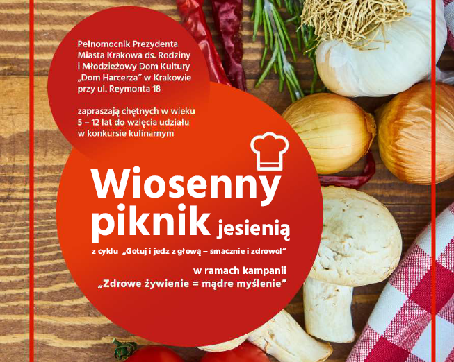 Pełnomocnik Prezydenta Miasta Krakowa ds. Rodziny Pani Marzena Paszkot wraz z Młodzieżowym Domem Kultury „Dom Harcerza” w Krakowie przy ul. Reymonta 18 zapraszają chętnych w wieku 5 – 12 lat do wzięcia udziału w konkursie kulinarnym „Wiosenny piknik- jesienią” z cyklu „Gotuj i jedz z głową – smacznie i zdrowo!” w ramach kampanii „Zdrowe żywienie = mądre myślenie”.